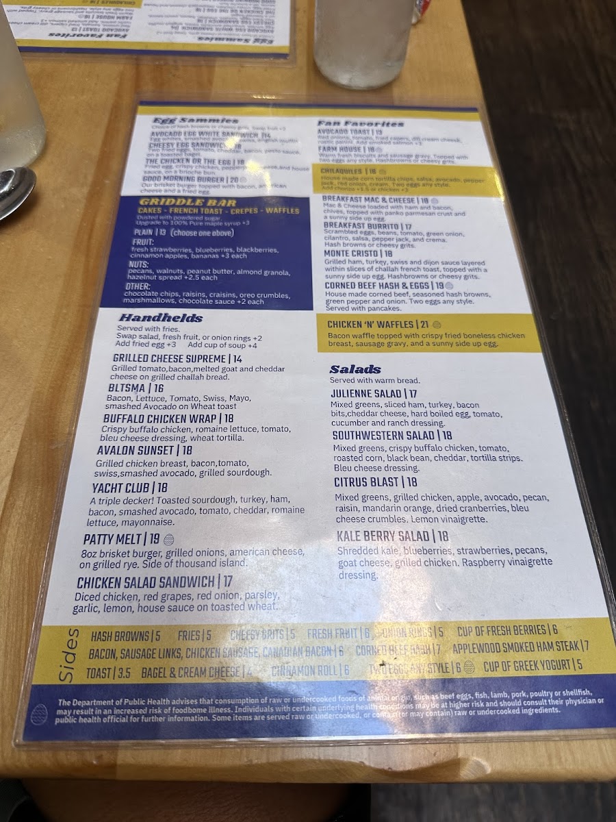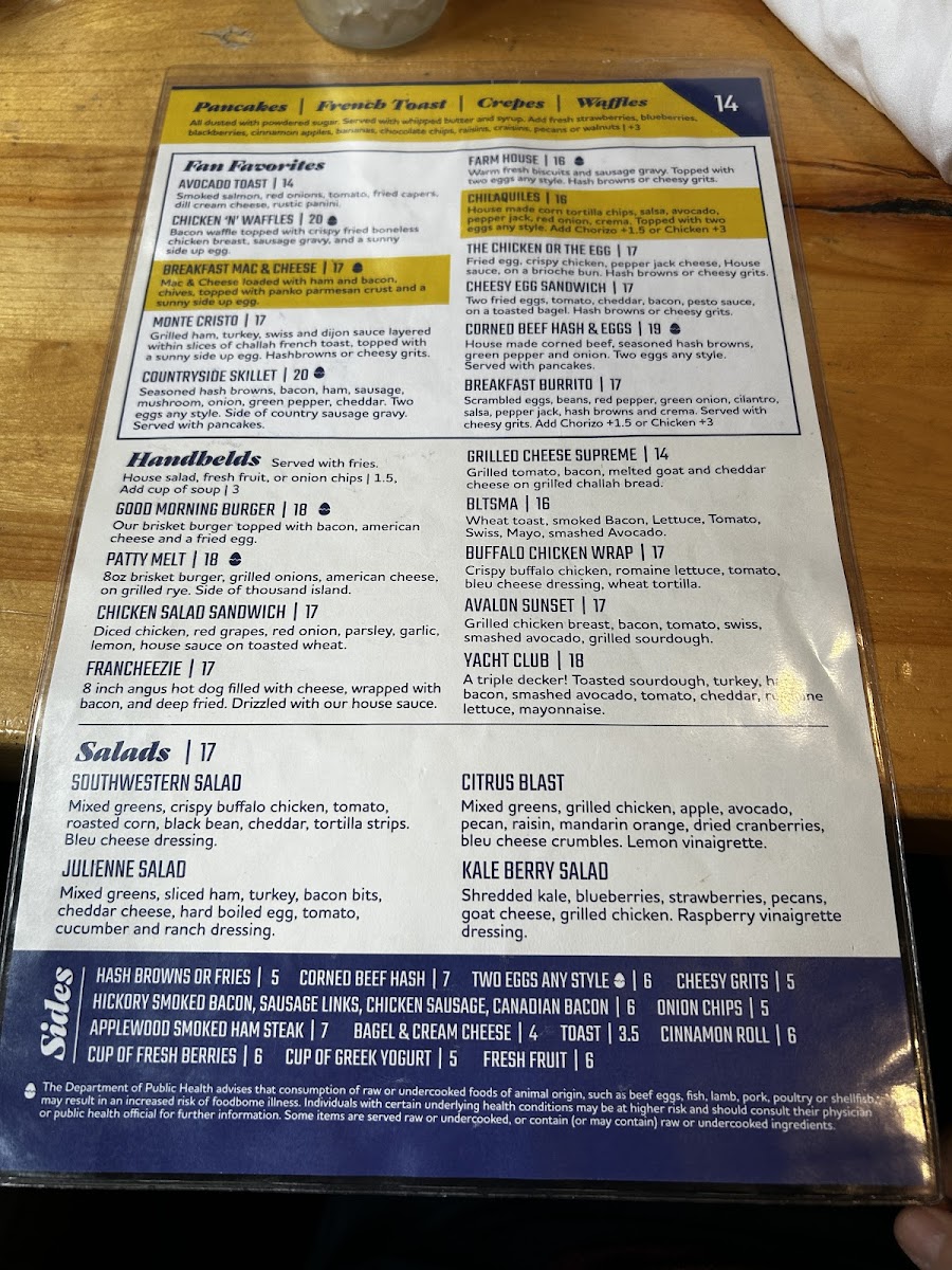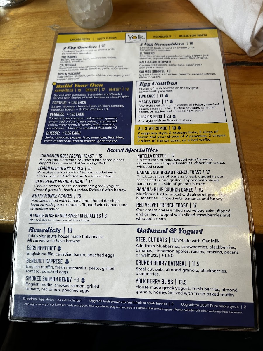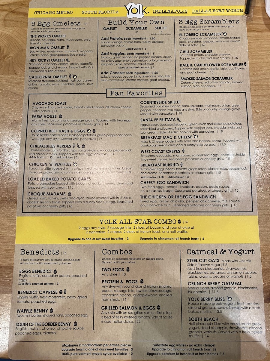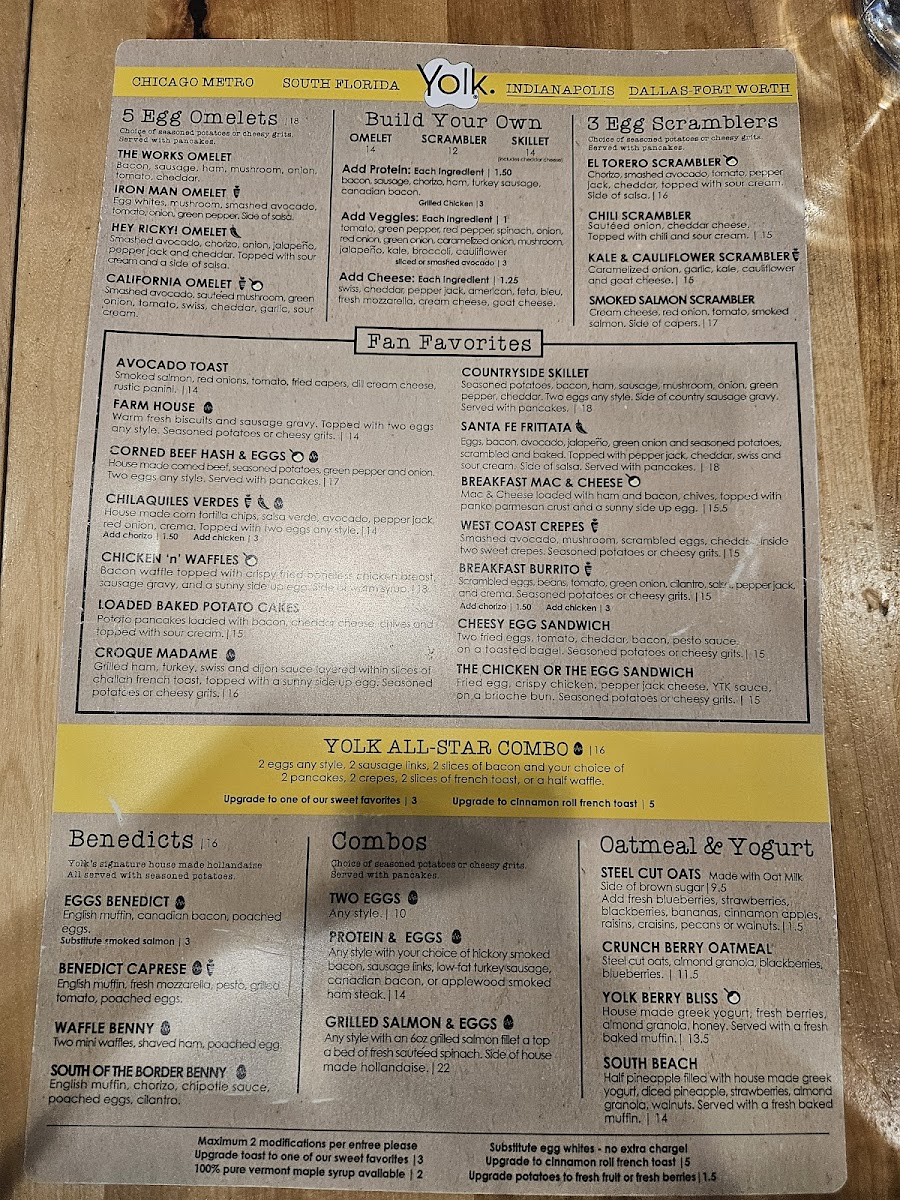 Egg whites, mushroom, smashed avocado, tomato, onion, green pepper. Side of salsa. (Vegetarian) Seasoned potatoes or cheesy grits. Toast, pancakes or English muffin.