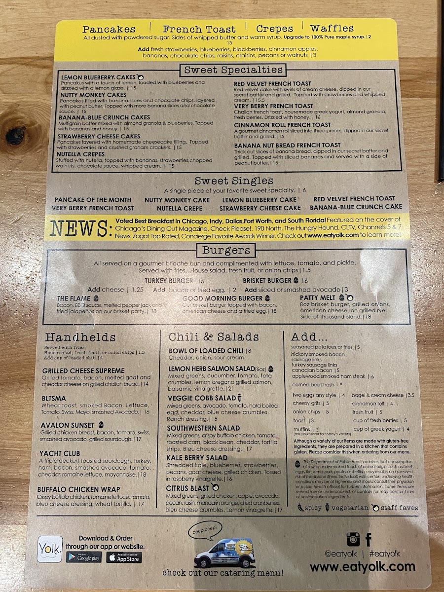 Red velvet cake with swirls of cream cheese, dipped and grilled in Yolk’s secret batter. Strawberries and whipped cream on top.